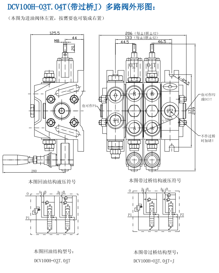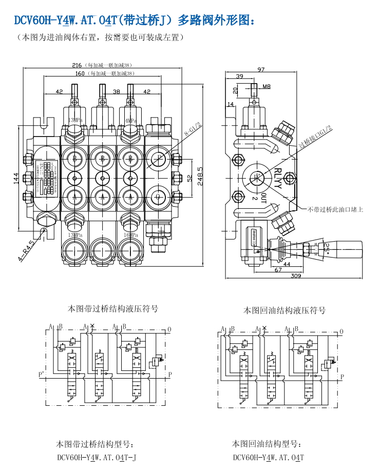 DCV系列多路換向閥是一種并聯(lián)的多路換向閥,中位采用專(zhuān)用流道卸荷,它由帶溢流閥的進(jìn)油閥、回油(過(guò)橋)閥體和若干個(gè)帶單向閥的換向閥組成;每組換向閥其工作油口可單獨配裝過(guò)載閥和補油閥。它具有體積小、重量輕、壓力高、通流量大的特點(diǎn);它可組成一到九個(gè)并聯(lián)的多路閥,其滑閥機能有0、Y、A三種基本型,按用戶(hù)需要,也可做成其它特殊型;其定位方式有彈簧復位和鋼球定位兩種。其滑閥尾部可做成伸出型并套有M8外螺紋,連接拉桿可實(shí)現兩端操縱。將回油閥體轉換成過(guò)橋結構可將壓力油輸入下一操作機構作壓力源。其進(jìn)油閥可左右隨意配置,本圖為右置,由于它的諸多特點(diǎn),現已在隨車(chē)起重機、鉆探機械和其它液壓機械中廣泛應用。