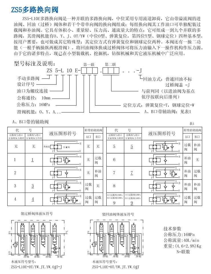 ZS5-L1OE多路換向閥是一種并聯(lián)的多路換向閥,中位采用專(zhuān)用流道卸荷,它由帶溢流閥的進(jìn)油閥、回油(過(guò)橋)閥體和若干個(gè)帶單向閥的換向閥組成;每組換向閥其工作油口可單獨配裝過(guò)載閥和補油閥。它具有體積小、重量輕、壓力高、通流量大的特點(diǎn);它可組成一到九個(gè)并聯(lián)的多路閥,其滑閥機能有0、Y、J、OT/YW(中位0型、彈簧復位,第四位Y型、鋼球定位)四種基本型,按用戶(hù)需要,也可做成其它特殊型;其定位方式有彈簧復位和鋼球定位兩種。本閥還有一操二功能(一根手柄操縱兩根滑閥)。將回油閥體換成過(guò)橋閥體可將壓力油輸入下一操作機構作壓力源。由于它的諸多特點(diǎn),現已在小型裝載機、挖掘機,鉆探機械和其它液壓機械中廣泛應用。